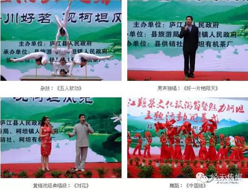 由廬江縣人(rén)民(mín)政府主辦,縣旅遊局等承辦的廬江縣茶文化旅遊節,2009年(nián)4月18日(rì),在柯坦茶鄉隆重開幕,由經天傳媒策劃、組織的開幕式文藝演出,現場掌聲不斷,好評如(rú)潮。