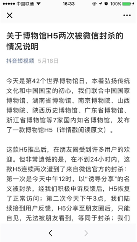 而微信官方對該情況回應爲限流情況,稱申訴可(kě)恢複。但(dàn)抖音後續稱該申訴至今未收到任何回複。