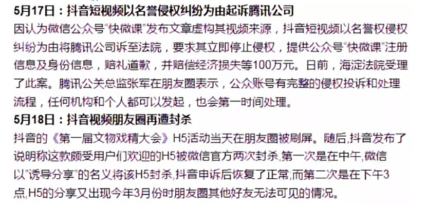 2018年(nián)5月以來(lái),“今日(rì)頭條”及“抖音”系列産品的實際運營者北京字節跳(tiào)動科(kē)技有限公司 、北京微播視界科(kē)技有限公司通過其自(zì)有新聞媒體(tǐ)平台等渠道大(dà)量發布、傳播貶損诋毀騰訊公司的言論、文章(zhāng)或視頻。