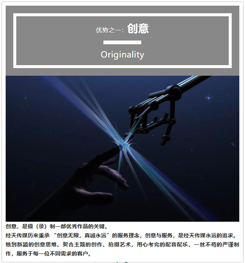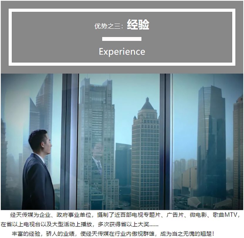 經天傳媒深耕專題片及相(xiàng)關影(yǐng)視制作20多年(nián),作爲公司業務三大(dà)模塊之一始終保持了良好的增長業績。公司高度重視中科(kē)專題片的拍(pāi)攝,抽調骨幹力量,組建拍(pāi)攝團隊,經過三天的集中拍(pāi)攝完成了實景素材的收集,專題片進入後期制作階段。經天傳媒将繼續秉承“創意無限,真誠永遠(yuǎn)”的企業服務理(lǐ)念爲廣大(dà)客戶提供特色鮮明、大(dà)氣磅礴、易于傳播的高質量宣傳片。